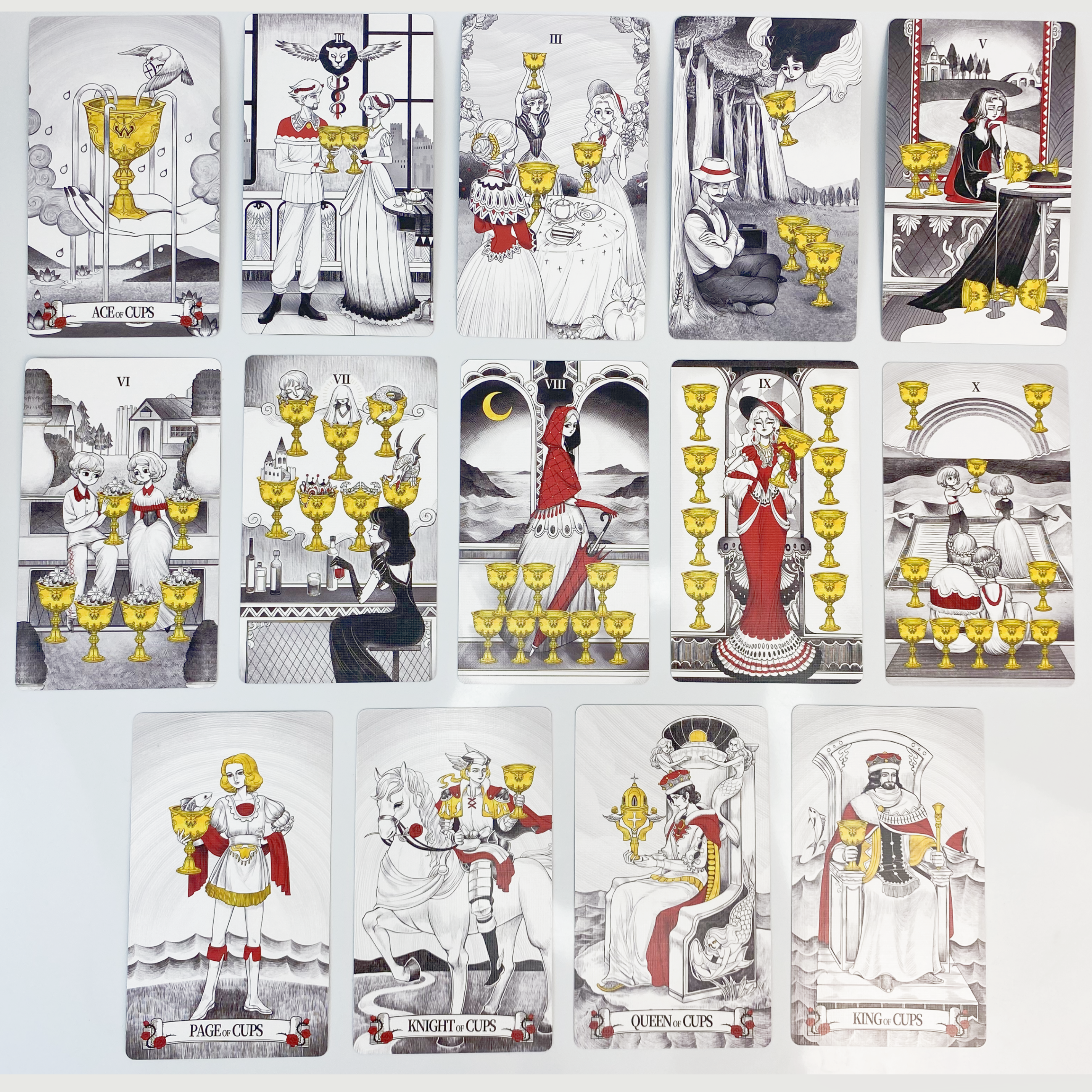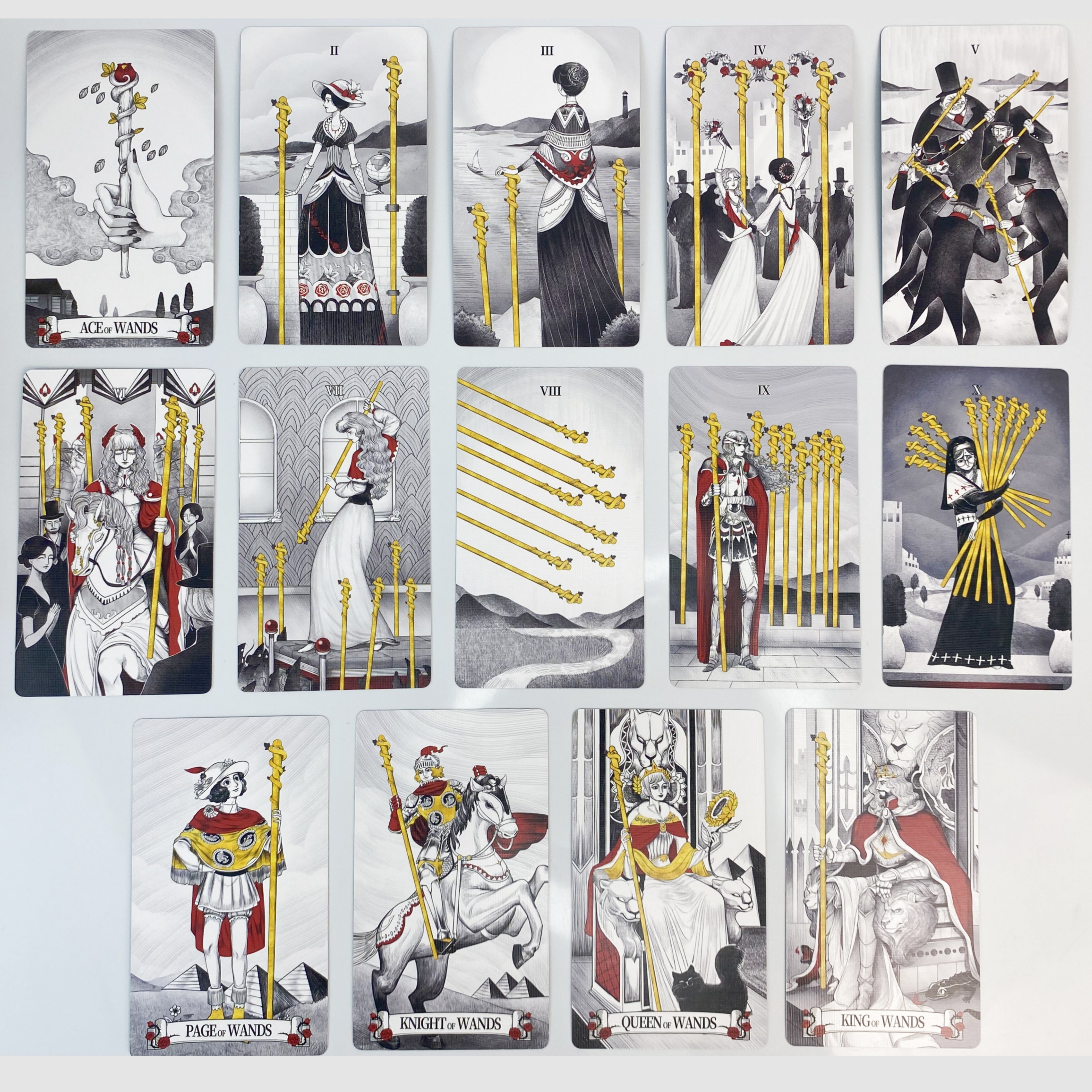 The Monochrome Realm features a palette of four colors—black, white, red, and gold—each symbolizing different facets of our inner selves: