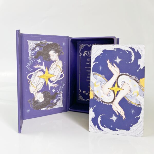 - Box: The deck comes enclosed in a beautifully designed book-shaped box, also featuring the skin-like texture velvet lamination. This not only adds elegance but also ensures the cards are well-protected.